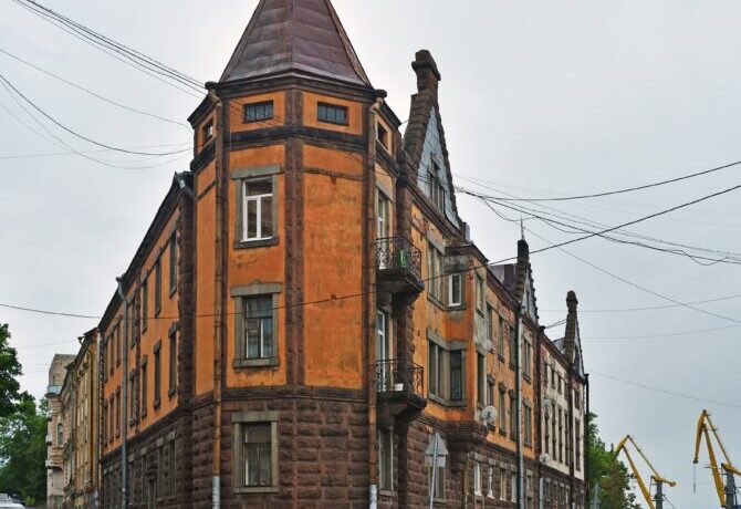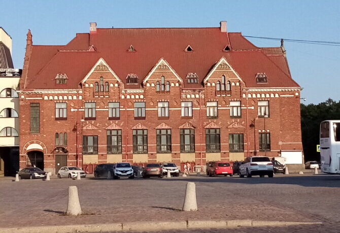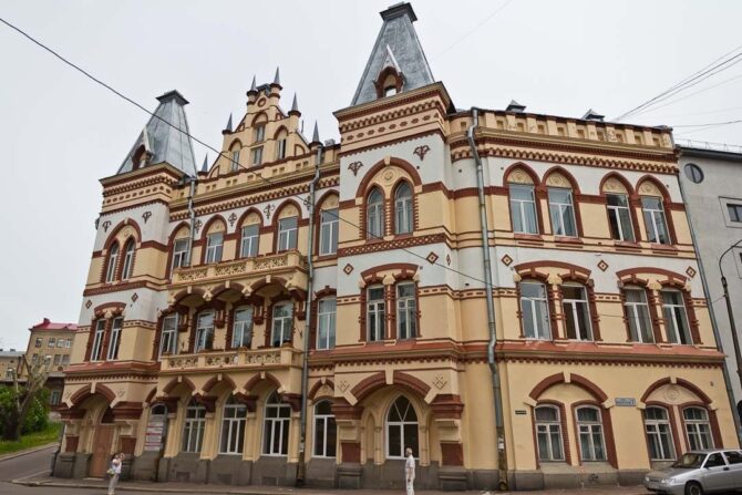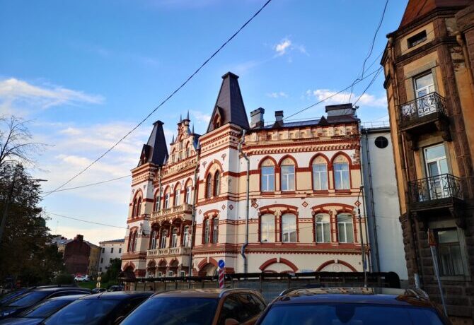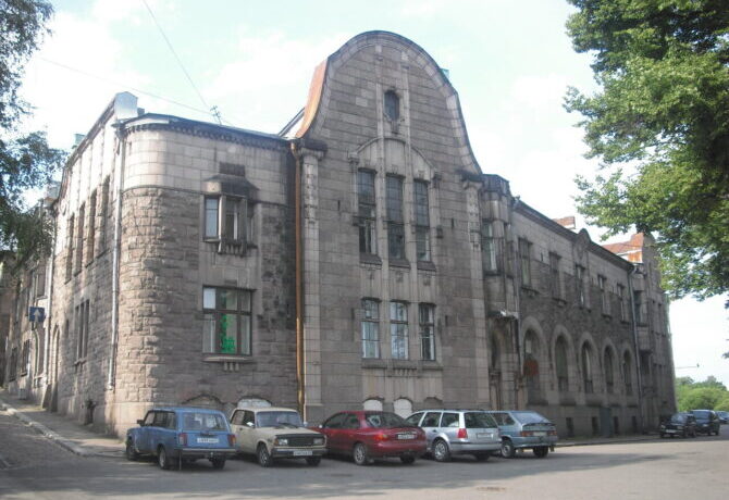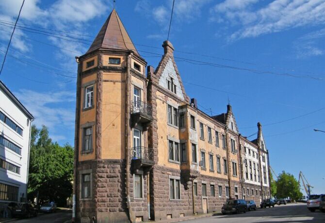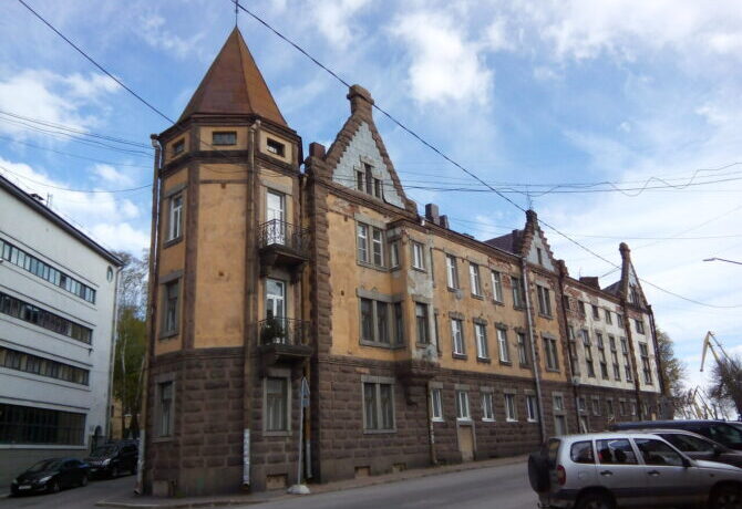 Дом в стиле неоготики появился в Выборге в конце 19 века по проекту архитектора Аспелина. Планировался как жилой дом, и долгое время таким и был, даже во время войны сильно не пострадал. Позже в нем разместили вечернюю школу, педагогический колледж, а сейчас местный филиал университета имени А.С.Пушкина. Несмотря на свой возраст, дом выглядит хорошо, помогает и реставрация, но все же фасад немного разрушен.