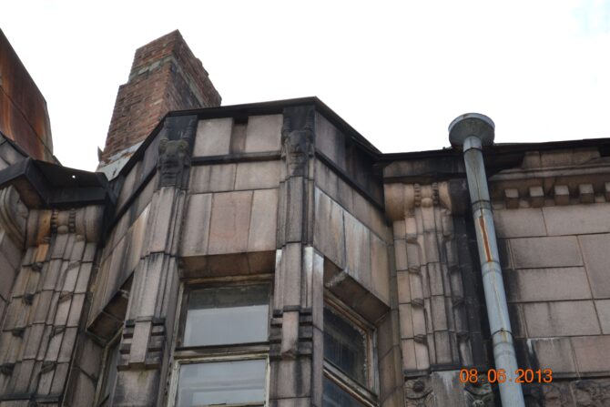 Для отделки дома архитекторы использовали красный гранит, который гармонично сочетался с брусчаткой, угол строения заканчивается изящной башенкой, фасад украшают скульптуры в виде женских фигур.