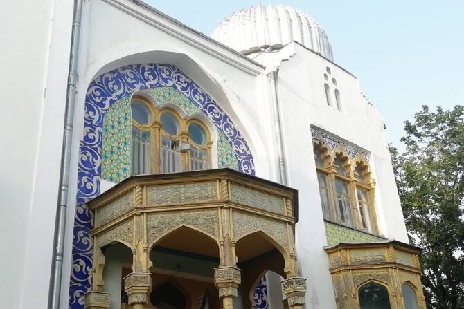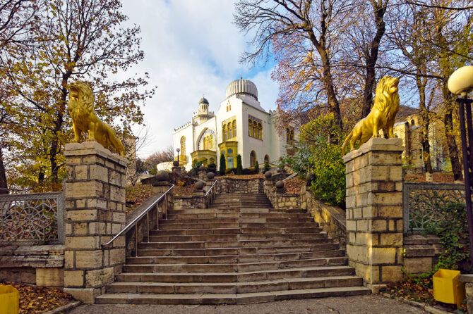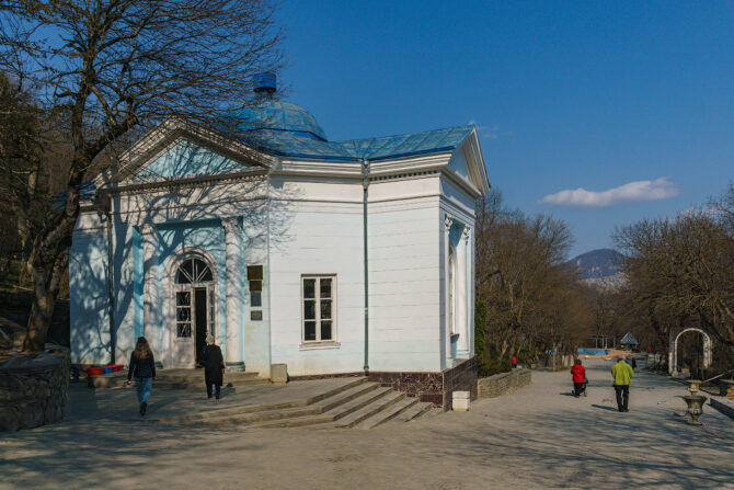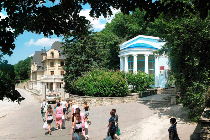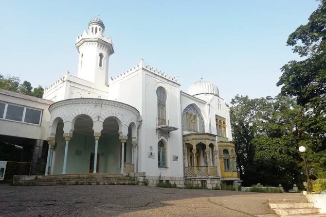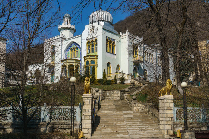 Еще одно здание с историей находится сразу у западного входа в Лечебный парк. Это дворец эмира Бухарского, строительство которого велось с 1907 по 1912 годы. Автор архитектурного проекта Владимир Николаевич Семенов использовал модную в то время эклектику – смешал неомавританский стиль с элементами модерна. Сегодня дворцовый ансамбль находится на территории санатория им. Тельмана.