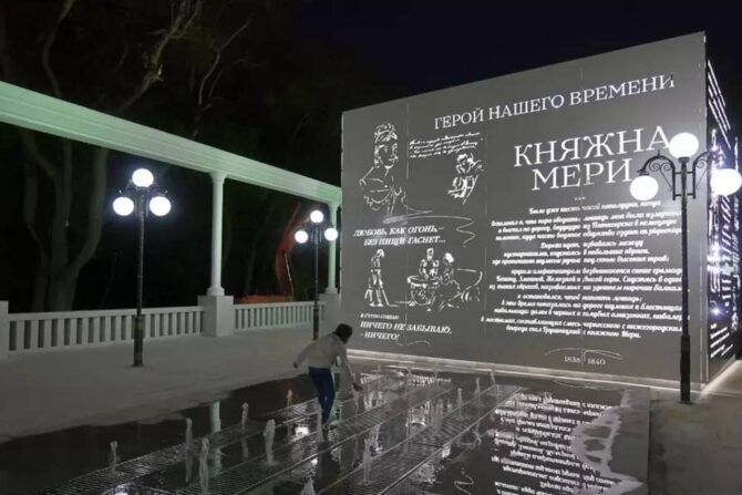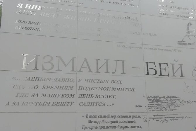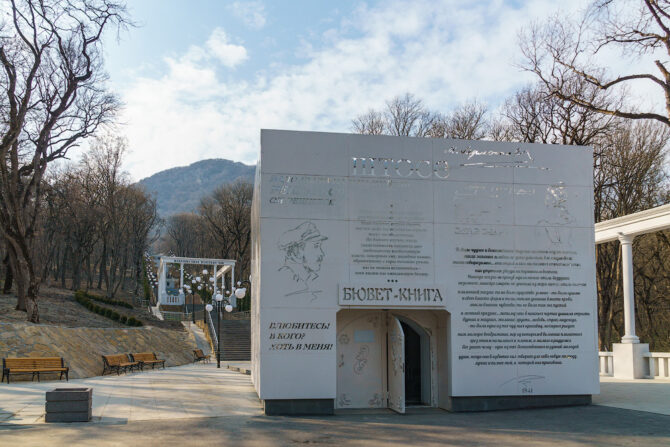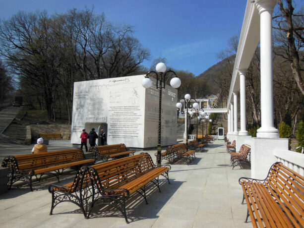 Непосредственно на каскадной лестнице расположен бювет, построенный в виде книги. Фасады строения исписаны строчками из произведения М.Ю. Лермонтова, причем строители применили технику специальной лазерной гравировки, полностью воссоздав почерк автора «Героя нашего времени», «Кавказа» и других произведений. За образец они взяли страницы из блокнота князя Одоевского, на которых поэт сделал записи. Тексты украшают рисунки автора, которые он также набросал в блокноте друга.