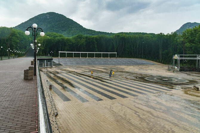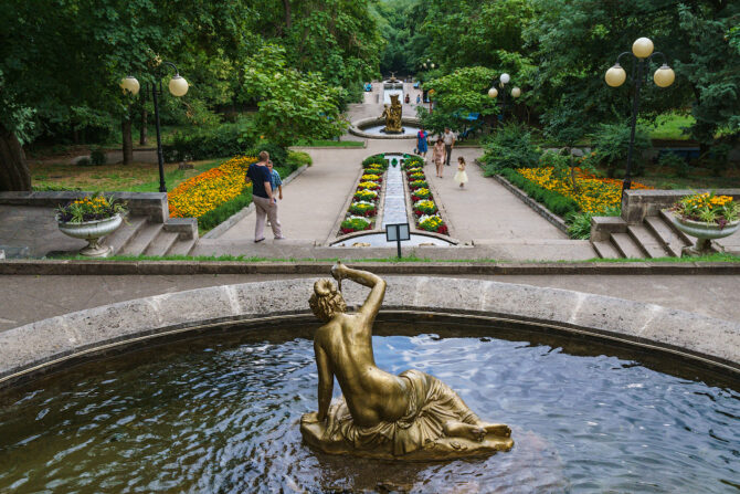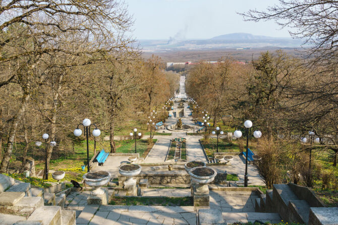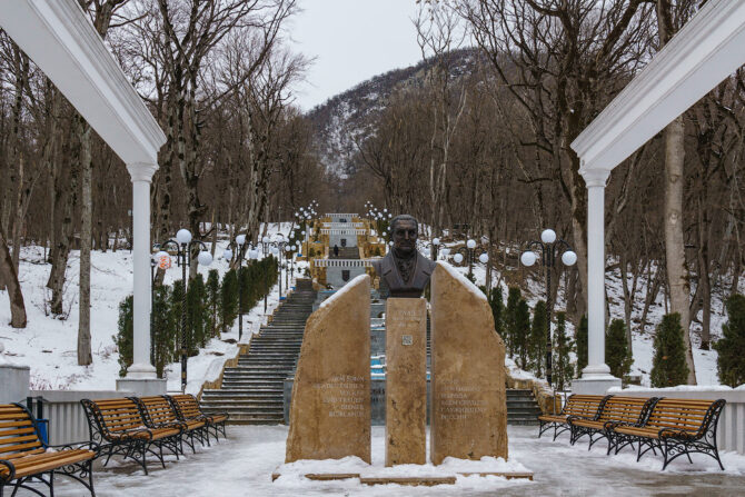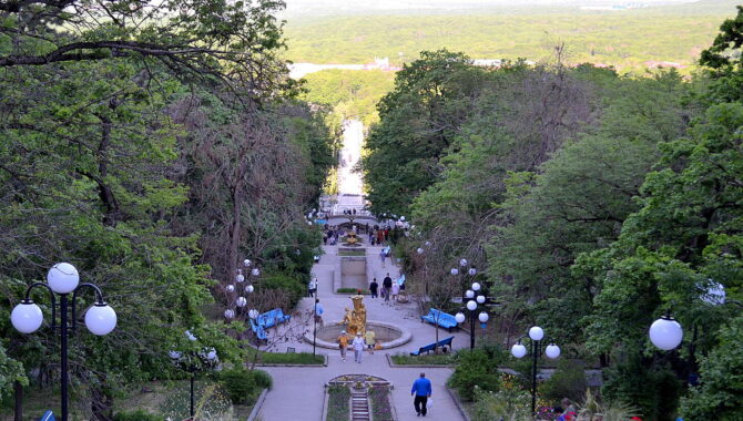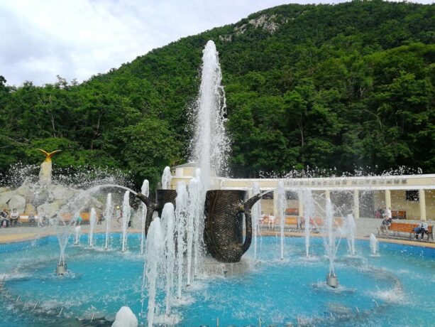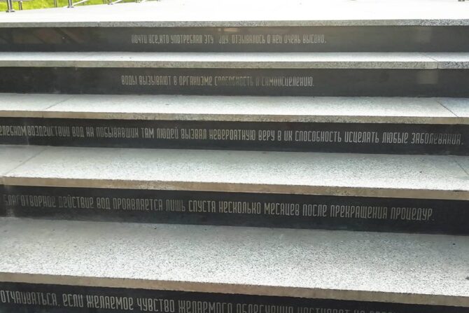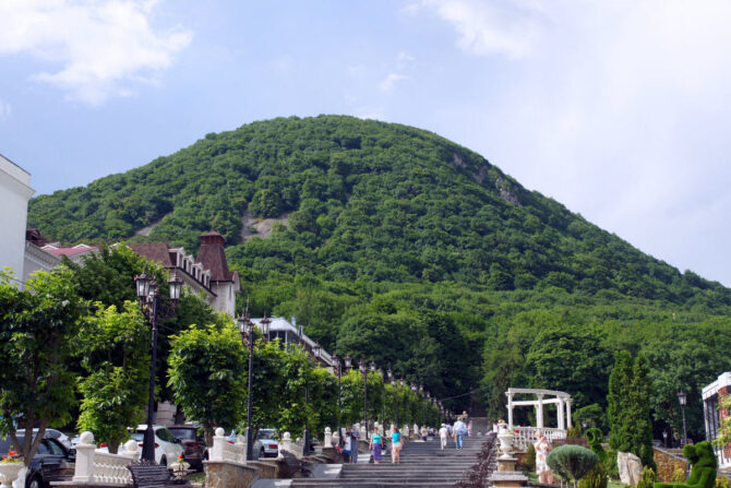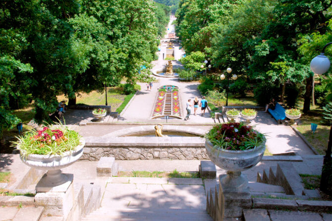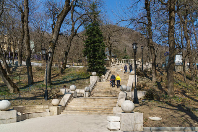 После Славяновкого источника стоит снова пойти к Пушкинской галерее и дойти до Смирновского источника. Он находится в 500 метрах. От него начинается каскадная лестница, состоящая из 1790 ступеней. Это еще одна знаковая достопримечательность курорта. ориентиром послужит фонтан в виде огромных бюветных кружек, а также статуя орла, установленная у источника. Чаши фонтана появились только в 2019 году и сразу стали одним из символов курорта. У лестницы более интересная история. Решение о ее строительстве было принято в 1930 годах. В 2019-м после реконструкции она стала длиннее на 600 метров благодаря появлению нижней части возле фонтана.