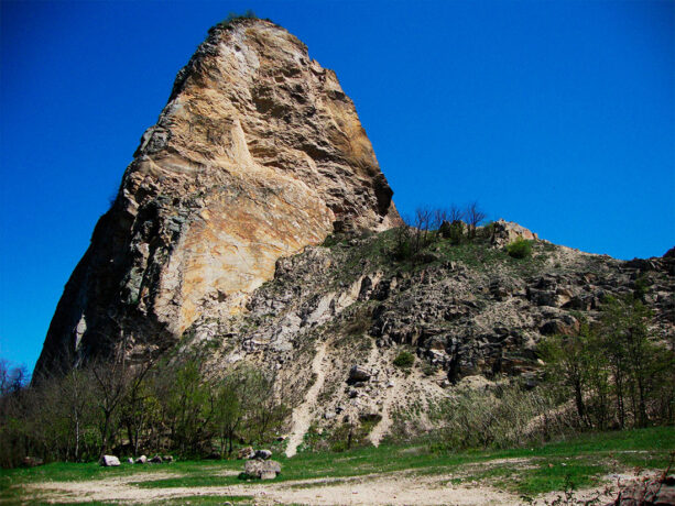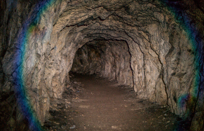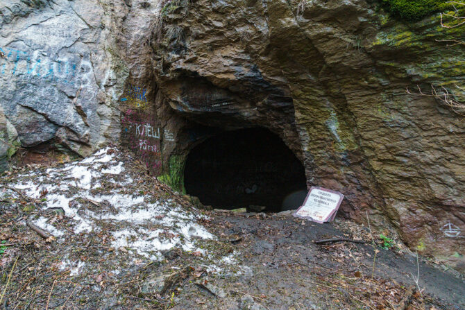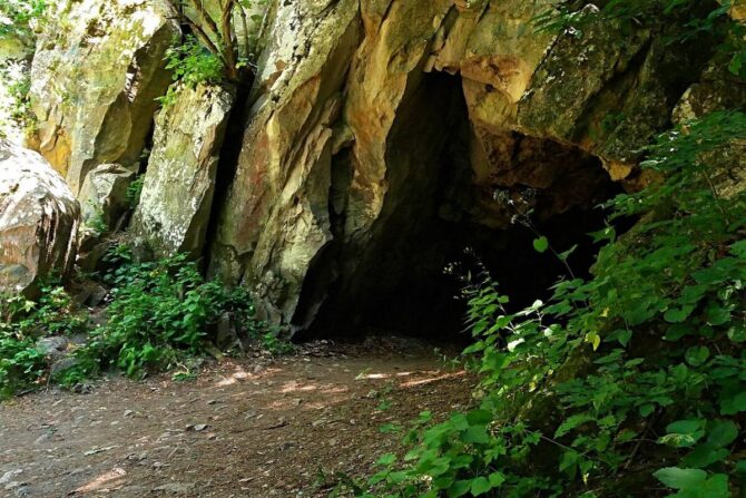 Ближайшей в Железной является гора Развилка. Здесь археологами были найдены остатки стоянок древних людей. Здесь же находится пещера, внутри которой температура воздуха редко поднимается выше нуля. Эта пещера – настоящее чудо природы. Даже в самую жаркую погоду в ней холодно, как на Севере. Камням не дают прогреться холодные пары воздуха, поднимающиеся сквозь трещины и разломы. Некоторые из них достигают глубины до 300 метров. Если летом здесь жутко холодно, то зимой, наоборот, можно погреться. Происходит обратная ситуация. Холодный воздух, попадая в недра, прогревается и выходит наружу, образуя проталины. На Развалке есть два таких объекта. Грот вечной мерзлоты находится практически в начале терренкура. Пещера больше известна, как «западная штольня». Она расположена также на тропе, но чуть дальше грота.