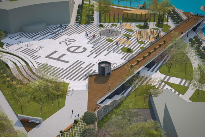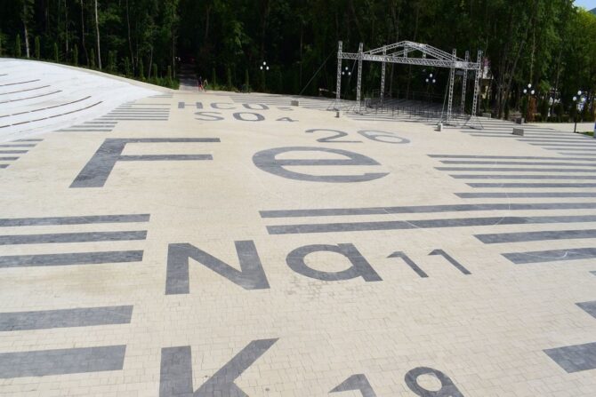 В самом центре Железноводска находится большой амфитеатр с прилегающей к нему площадью. Свое название она получила в честь элементов химической таблицы Менделеева. Ее заложили по проекту продления каскадной лестницы в 2019 году. В центре площади расположены латинские обозначения элементарных частиц, которыми богаты местные минеральные воды. Главным из них является Fe (железо), атомная масса которого совпадает по значению с региональным номером Ставропольского края. На территории установлен фонтан в виде солнечных часов, а сама площадка предназначена для проведения концертов и других мероприятий.