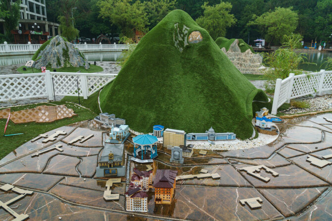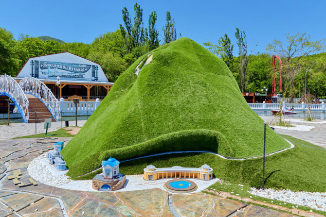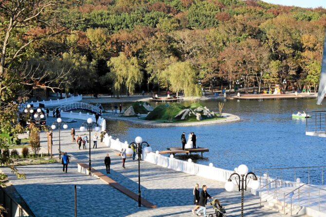 Курортное озеро появилось в 1954 году. Сначала на его берегах можно было позагорать и порыбачить. Затем оно начало заболачиваться из-за стоячей воды. После реконструкции на его берегах появились первые арт-объекты, а остров превратился в отдельную достопримечательность. Уникальность расположенных на нем 3D-макетов санаториев и архитектурных строений заключается в том, что все они созданы руками детей. Все они полностью соответствуют оригиналам. Их созданием занимаются воспитанники детских Центров молодежного инновационного творчества.