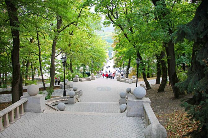 Существует несколько весомых причин прогуляться по каскадной лестнице Курортного/Лечебного парка. Во-первых, она является самой длинной на южных курортах России. Ее протяженность составляет 860 метров. Во-вторых, верхняя часть полностью сохранила очарование 30-х годов – каменные цветники, гипсовые скульптуры, фонтаны со сказочными фигурами – все это создает неповторимую атмосферу старины. В-третьих, прогулка не станет утомительной благодаря каскадной системе возведения, а также большого количества установленных скамеек. Вдоль лестницы высажена туя. Это не только красивое декоративное дерево-куст, применяемое в ландшафтном дизайне. Вдыхание эфирного масла туи полезно при заболеваниях органов дыхания. Прогулка по каскадной лестнице подарит бодрость и хорошее настроение.