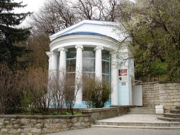 Изящное по архитектуре здание было построено по проекту А.И. Кузнецова в 1916 году. Это полуротонда с ровной террасой на склоне горы. Она сохранилась, была отреставрирована. На месте бывшей Казенной гостиницы теперь разбит сквер. В 1988 году рядом с бюветом установили памятник великому русскому поэту М.Ю. Лермонтову. Вокруг установлены скамеечки, на которых можно посидеть в тени деревьев и почитать его стихи.