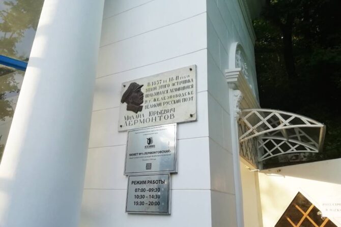 Это как раз тот самый источник, который одним из первых стал основой лечебной базы курорта. Его открыл Ф.П. Гааз. Ему обязан своим рождением и становлением город Железноводск. Изначально он был назван Константиновским, затем Ленивым и только в 1964 году, в честь 150-летия со дня рождения М.Ю. Лермонтова, получил название, под которым известен в наши дни. Говорят, что поэт бывал в этих краях, принимал калмыцкие ванны, здание которых было рядом, но не сохранилось, пил воду именно из этого источника. Здесь были установлены первые купели, а затем калмыцкие ванны, которые по форме напоминали кибитку. До революции это место называли Конторской площадкой. Здесь находилась Казенная гостиница, которая была сожжена в 1943 году отступающими немецко-фашистскими войсками.