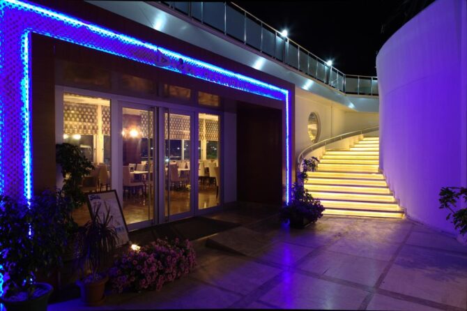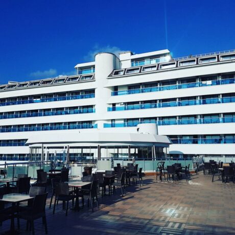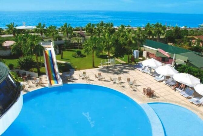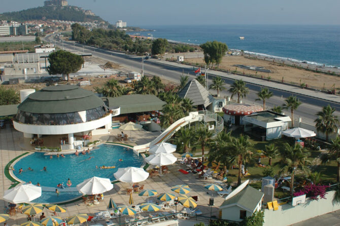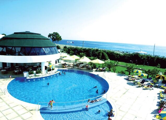 Drita Hotel 5* Турция, Махмутлар, Алания привлекает туристов прежде всего своим интересным внешним видом и удачным расположением относительно побережья. Над идеально круглым бассейном с прозрачной водой нависает крытая круглая терраса, из окон которой можно любоваться морем, имеющим здесь чистый изумрудный оттенок.