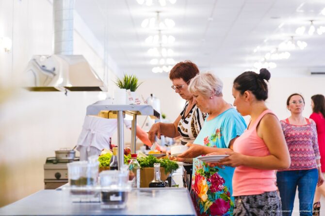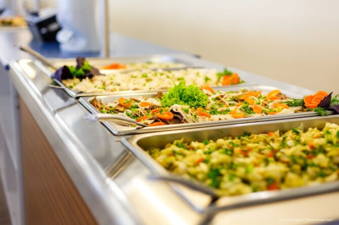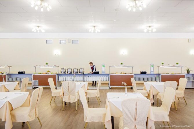 Каждый гость может рассчитывать на вкусный обед. Основное правило отеля – кормить сытно, вкусно и максимально сбалансировано. В летний сезон блюда подаются 5 раз в день. Это связано с тем, что персонал отеля хочет максимально исполнить все желания гостя и сытно его накормить. Только так можно соблюсти требования отдыхающих относительно детского, диетического, витаминизированного и вегетарианского питания. Чтобы реализовать такое меню, устанавливаются специальные столы. Отдельно накрывается зона для деток, которая декорируется игрушками, ковролином, маленькими стульчиками и большой плазмой, которая не навредит зрению.