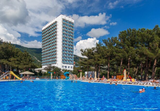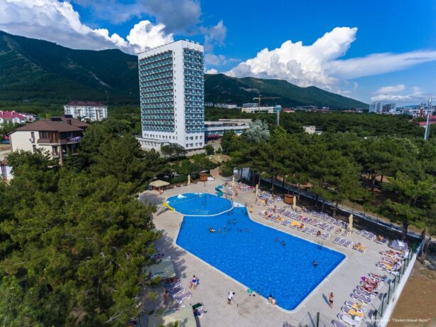 Пансионат Приветливый берег – один из наиболее популярных отелей, которые расположены на первой береговой линии. Любоваться морем можно из любого номера. Здание состоит из 17 этажей. Возле пансионата есть аквапарк, кафе и канатная дорога. Всего за несколько минут можно добраться до центра города. У отеля собственный частный пляж. Также есть бассейн. Завтрак подается в виде Шведского стола.