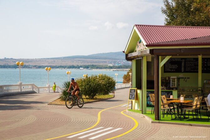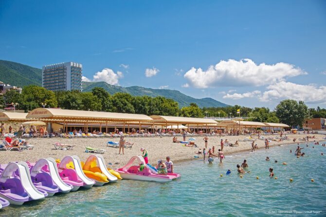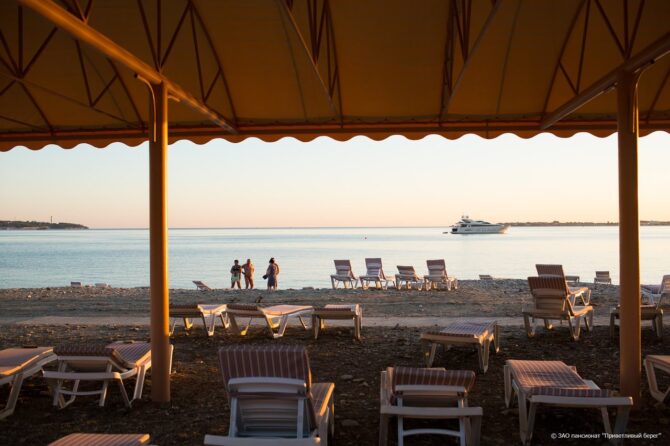 Вход на пляж пансионата Приветливый берег осуществляется посредством специальной карты гостя отеля. Для активного отдыха отель предлагает воспользоваться гидро-велосипедами, гидроциклами, парашютом. Можно отправиться на прогулку на катере или на банане. Чтобы гостям не нужно было часто возвращаться в отель, на пляже есть специальное кафе. Это отличный бар, в котором можно заказать любой напиток. Это очень удобно, поскольку можно прямо на пляже заказать все необходимое. Для деток есть вкусные лимонады, а родители в свою очередь могут заказать и что-нибудь покрепче.