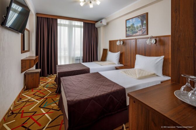 В отеле «Приветливый берег» около 250 номеров. Территория просторная. Есть игровая детская площадка, для взрослых установлен настольный теннис. Чтобы в полной мере насладится красотой природы можно арендовать велосипед. Можно прогуляться по набережной, перекусить в ресторане и насладится морскими красотами. Аквапарк и дельфинарий помогут найти развлечения для маленьких путешественников. Можно прокатиться на канатной дороге и сделать уникальные фото. В городе скучать не получится. Поскольку ежегодно приезжает огромное количество отдыхающих, структура развита максимально. Развлечений очень много.