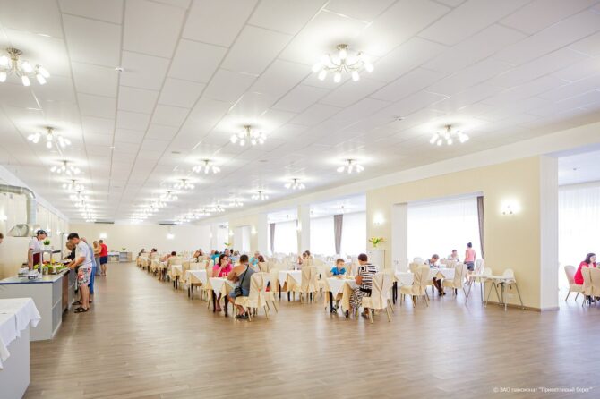 Основной ресторан пансионата выполнен в бело-молочных тонах. Интерьер очень уютный и настраивает гостей на позитив своей атмосферой. Гостям предлагается огромный выбор блюд от лучших поваров отеля. Есть действительно очень много вкусного и в то же время полезного. Подача осуществляется посредством шведского стола. В зале устанавливают столы с гарниром, основными блюдами, рыбными и мясными блюдами, различными салатами и десертами в том числе. Особое внимание уделяется чистоте столовых приборов.