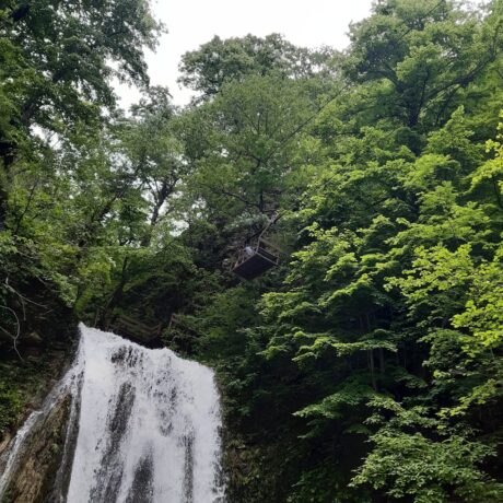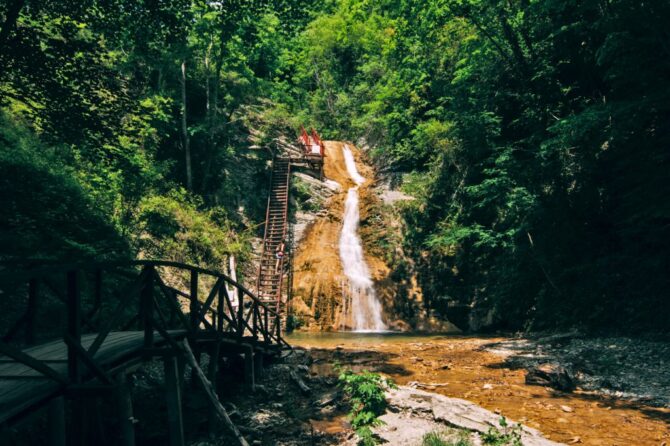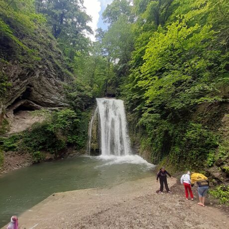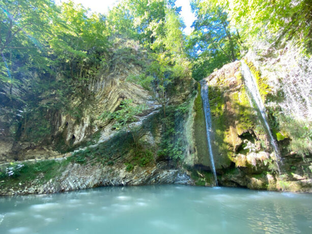 Территория благоустроена, установлены лесенки, скамейки, перила в опасных зонах. Народа всегда тьма, особенно после обеда. Подъем без автомобиля продлится около 3 км. Это изнурительно долгий маршрут в гору, который вряд ли выдержат маленькие дети. В самом начале пути гостей приветливо встречают в кафе и медовой лавке. Здесь можно купить мед с горной пасеки, варенье из инжира и кизила. У подножия горы построена банька. Рядом с ней установлен бассейн с лечебной голубой грязью. Сразу за ним – озеро с прохладной водой из горного ручья. Подъем до водопадов, фотоссесия и спуск займут приблизительно 40 минут.