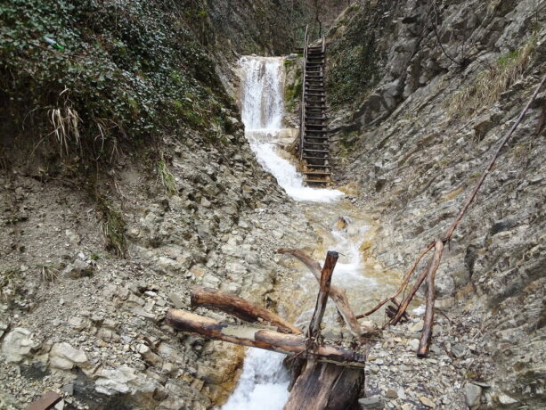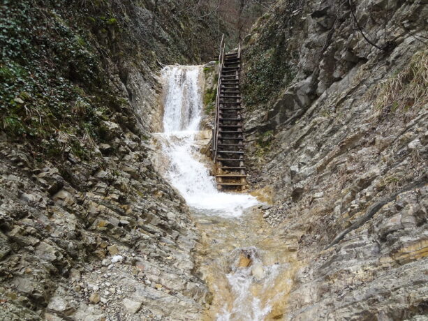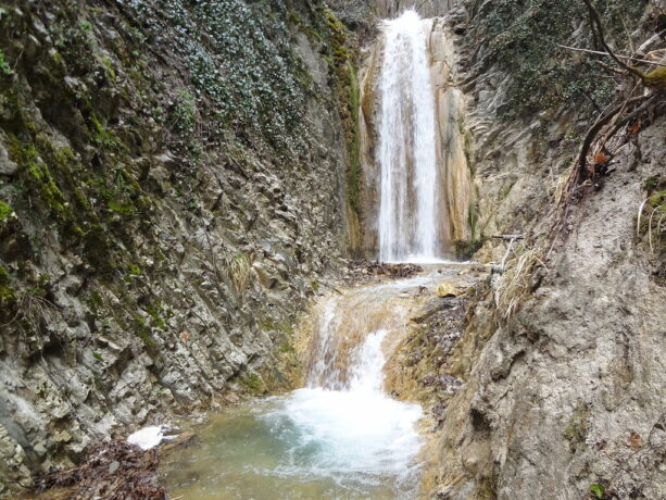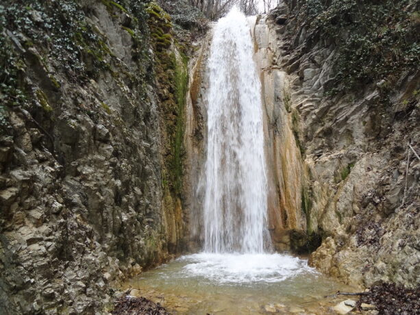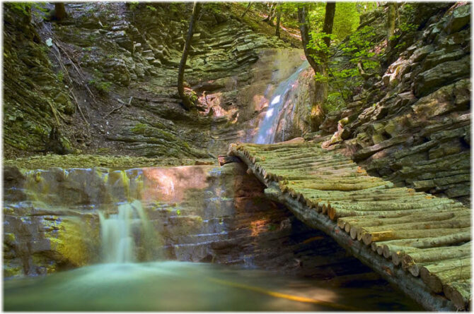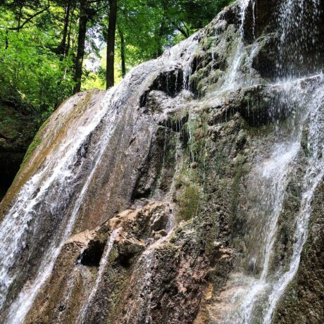 Первый водопад находится сразу за двумя источниками. В одном из них воду можно пить, в другом это делать не рекомендуется. Указатель подскажет, в каком роднике течет живая вода, а в каком мертвая. 13-метровый водопад получил название «Хрустальный». Это очень красивое место. Кристально чистая вода стекает в каменный бассейн с мелодичным звуком, напоминающим звон бокалов. В чаше можно купаться.