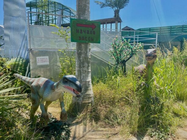 Фигуры динозавров расположены вдоль тропинок. Возле каждого экспоната установлена табличка с описанием животного, его природных особенностей, время и места обитания. Если купить экскурсию, то гид расскажет массу занимательных и познавательных историй о вымерших рептилиях. Со всеми экспонатами можно фотографироваться. Рядом с комплексом расположены отели, предлагающие доступное по ценам проживание. Среди них есть санатории, предоставляющие полный пансион и комфортабельные гостевые дома с минимальным количеством соседей. В шаговой доступности находится дельфинарий «Немо», в котором можно продолжить знакомство с миром развлечений в Джубге.
