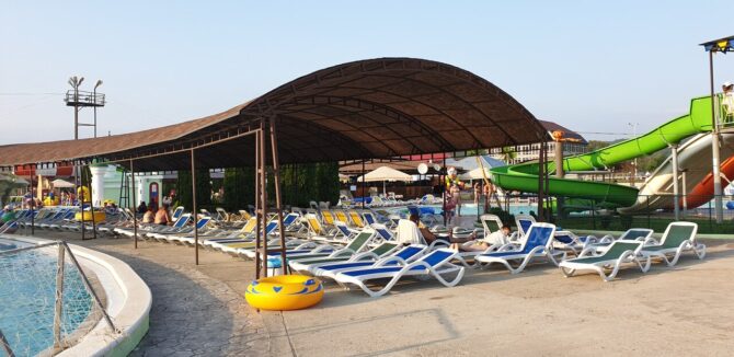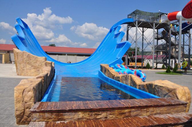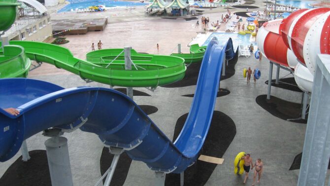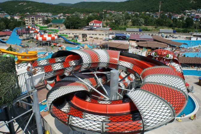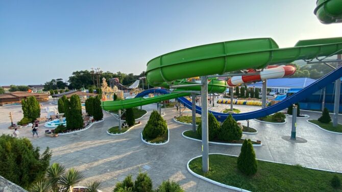 Многие отмечают художественное оформление аквапарка. Например, один из экстремальных аттракционов выполнен в форме гигантской кобры. Ее капюшон виден буквально из всех уголков поселка. Благодаря такому яркому ориентиру, даже новичок быстро сориентируется, куда идти. Возле каждой водной горки дежурят инструкторы. Они выдают инвентарь для спуска (коврики, ватрушки или надувные круги), следят за порядком. Все спуски заканчиваются в общем бассейне «Ленивая река». Он опоясывает территорию водных аттракционов, поэтому к следующему из них не обязательно идти пешком, можно добраться вплавь.