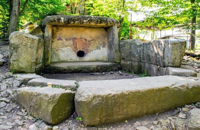 Большому джубгинскому дольмену более 5 тысяч лет. Он хорошо сохранился. Поэтому был включен в список древних мегалитических памятников. Он находится в парке бывшего санатория Центросоюза. Дольмен сложен из четырех плит, сверху накрыт еще одной каменной плитой. Перед стеной с отверстием огорожена небольшая площадка. ученые считают, что она использовалась для сакральных ритуалов, а сами дольмены служили усыпальницами или домами для душ умерших соплеменников.