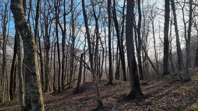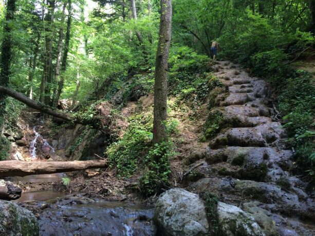 Если хочется отдохнуть от людей, то можно прогуляться к другим водопадам. Дорожный съезд из поселка Пшада ведет к туристическому маршруту «Затерянный мир». Этот путь считается самым удобным для автомобилистов. Ехать по нему лучше всего в летнюю пору, так как в сезон дождей лесные дороги размываются. Возле входа на тропу машину придется оставить и дальше идти пешком. Каменистая тропинка ведет через лиственный лес. Здесь растут грабы, дубы, буки, лещина (фундук). Ореховые кустарники отмечены табличками.