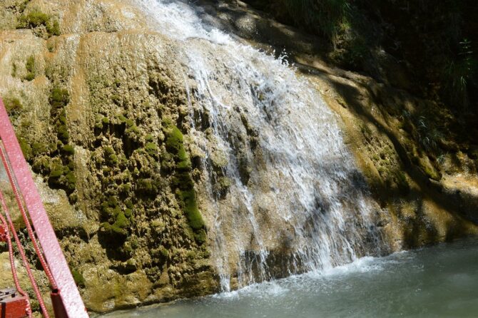 Расстояние до первого водопада составляет 3 км. 3-х метровый водоскат, с которого начинается осмотр достопримечательностей, очень широкий. Струи падают с высоты, образуя водяную завесу. Можно зайти под каменный навес, чтобы сфотографировать ее изнутри. У подножия второго водопада образован большой бассейн. Возле него обычно останавливаются на привал, любуются природой и устраивают перекус перед продолжением пути. Третий похож на человеческий нос, поэтому он так и называется – «Нос». Следующие два не выделяются какими-либо особенностями. Зато за шестым есть пещера. Ее зал покрыт сталактитами и сталагмитами, образующими замысловатые скульптурные композиции.