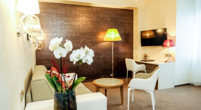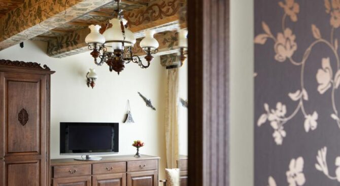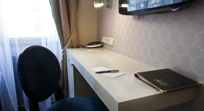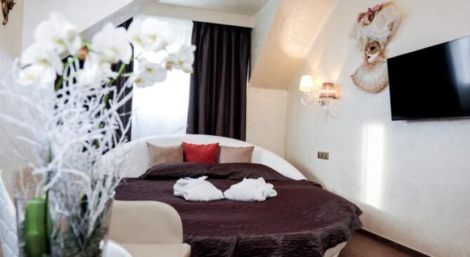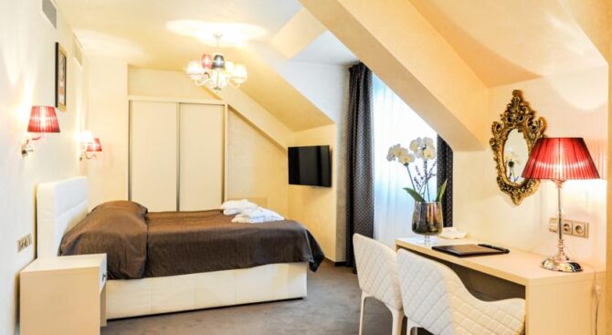 The rooms are distinguished by a design in the Baroque style and are equipped with everything necessary to make the guest as comfortable as possible: tea and bathroom accessories, TV, free Wi-Fi.