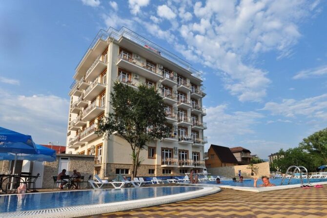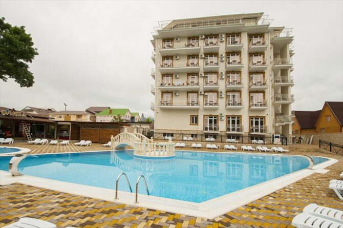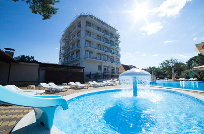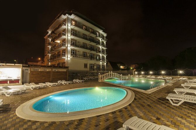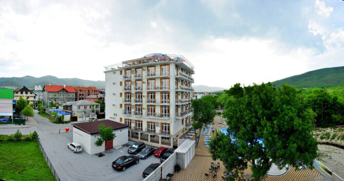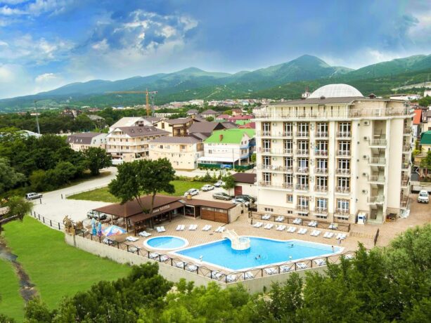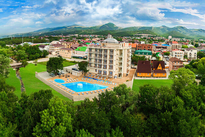 The hotel is comfortably located among the centuries-old evergreen forests, 12 km from the center of Gelendzhik on the shore of Tsemes Bay. Here, mountain rivers flowing from the Markotkh Range flow into the Black Sea. A wide valley smoothly descends to the sea. From storms, the coast is protected by Cape Doob, so almost the entire coastline is divided into beach areas. Taking into account the geographical and climatic advantages of the area, there was a decision to build a hotel complex of European class in Kabardinka.