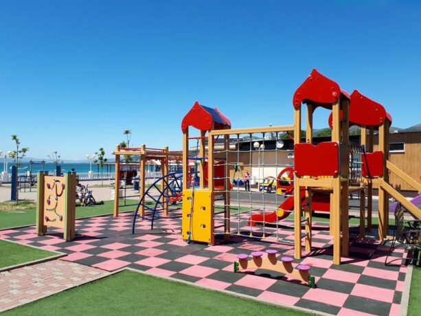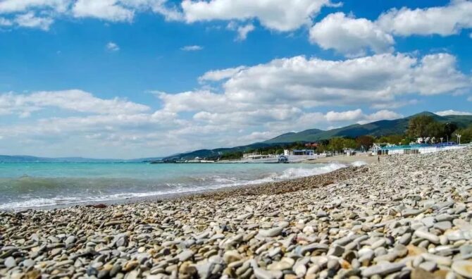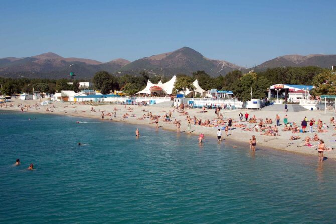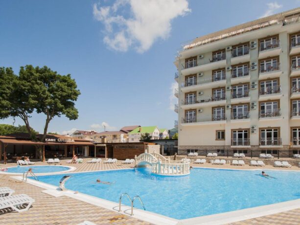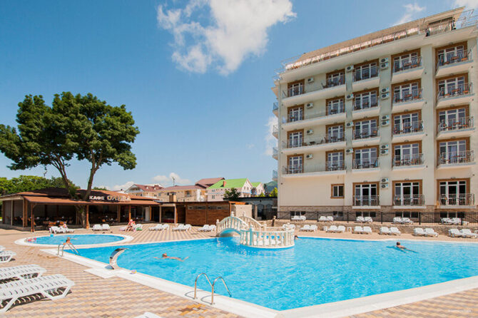 The main type of recreation at the resort is the beach. The central beach of the village is 620 metres (7 minutes’ walk) from the hotel. The entrance is located on the Kabardinka Embankment. As with the entire local coast, the coating consists of small and medium pebbles. The depth increases evenly, but quickly. In the infrastructure of the beach: rental of sun loungers, canopies, water attractions (riding on a banana, tablet, parachute, jet ski), changing rooms, shower, toilet, catamaran rental, children’s play area. On the right is the pier, from which pleasure boats depart. The area has a wide variety of cafes and eateries.