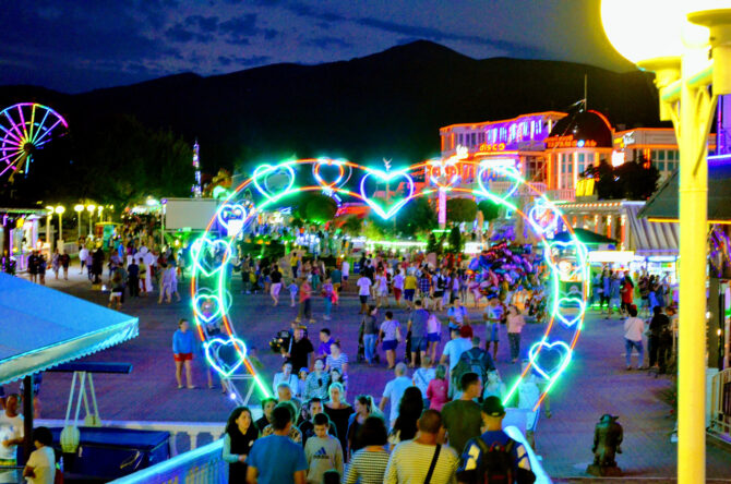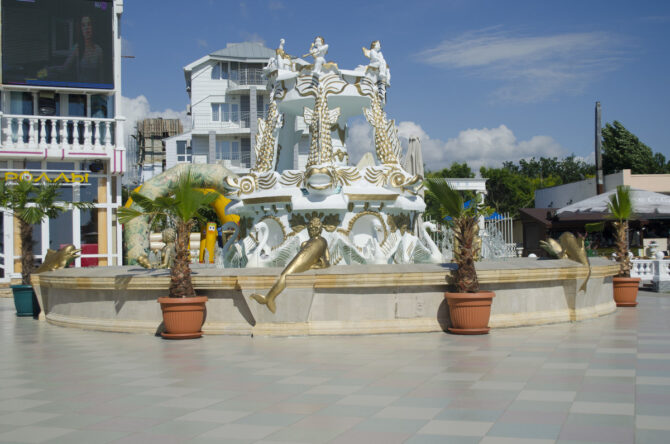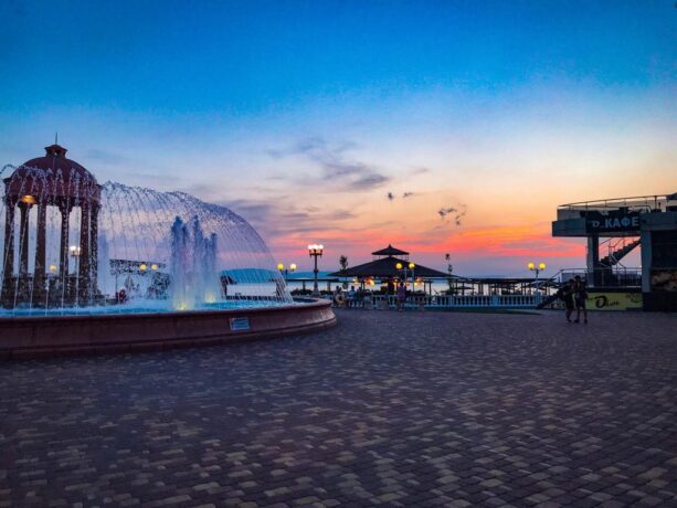 In the heart of the Embankment there is a snow-white fountain, from a distance resembling a cake with whipped cream. Gilded figures in the morning sparkle in the sun, in the evening they are illuminated with the help of illumination. During the walk, you can visit numerous cafes and restaurants, ride on the Ferris Wheel, look into the karaoke club “Seagull”, where vacationers are waiting for live music, an excellent bar card, menu, as well as bowling.