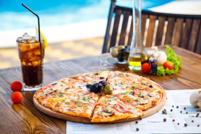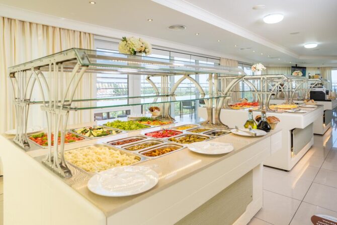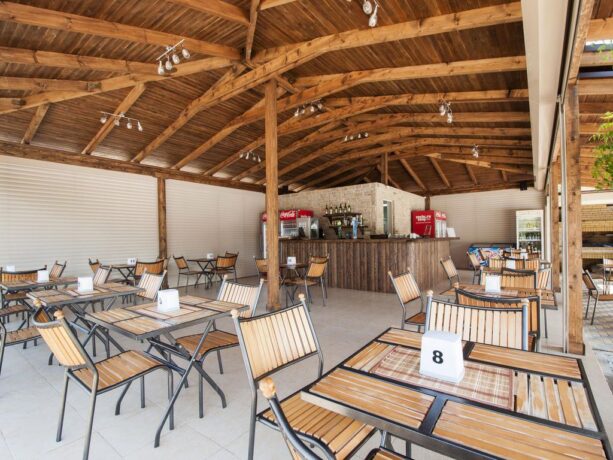 In the recreation area of the hotel there is a café “Oliva”. It is located near the pools. The main assortment consists of a variety of drinks, desserts, fruits and sweets. But you don’t have to leave the lounge during lunch. The kitchen of the café offers a lunch menu and dishes of Caucasian, Greek or Cypriot cuisine. Meat, vegetables, grilled fish are also served here, wonderful pizza is baked.