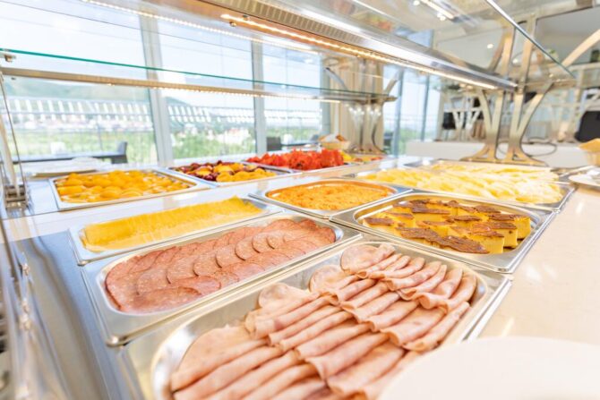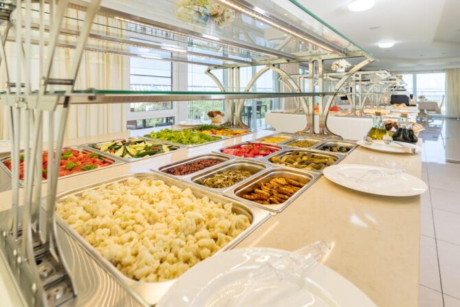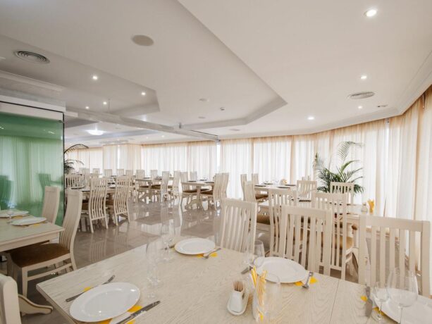 Prices are not very expensive. Guests can easily afford to order breakfast, lunch or dinner à la carte or use the complexes. The restaurant opens at 07.30 am. Until 10.30 guests will have a continental breakfast, then from 13.00 to 15.00 – lunch. For dinner, the hall is prepared for 18.00. The kitchen closes at 20.00, if there are no special orders for service. It is possible to arrange full or semi-board not only at the time of booking, but also during the stay at the hotel.
