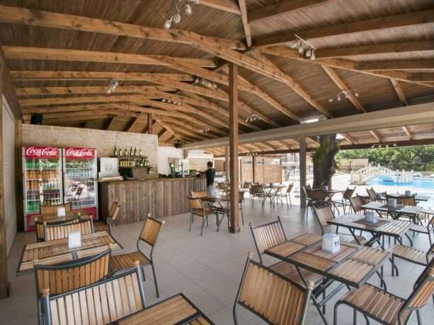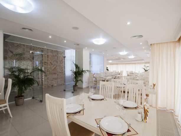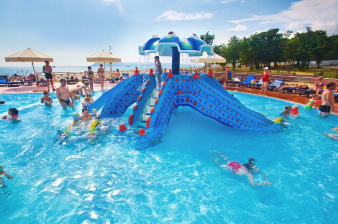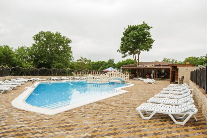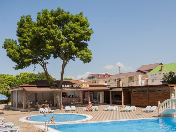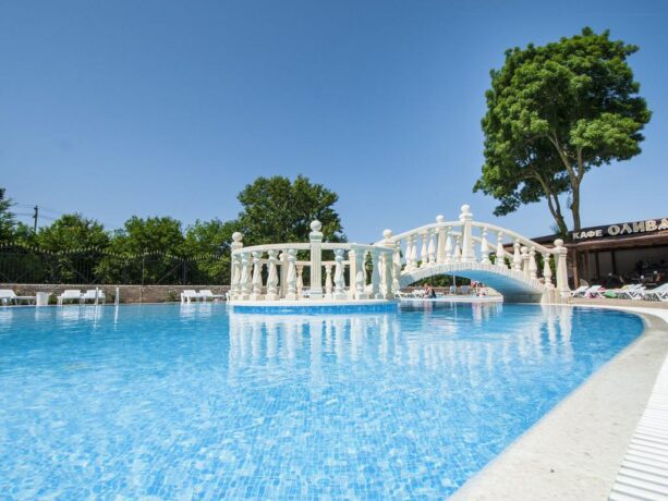 In the recreation area of the hotel there are two swimming pools – children’s and adult. Both are open, heated. The water is fresh. The swimming pool for adults is decorated with a snow-white bridge. Around it there are sun loungers, tables, vacationers have the opportunity to order drinks and snacks in the café “Oliva”. In the “paddling paddling” there are water slides and a splash attraction. The large heated swimming pool is open from mid-April to November.