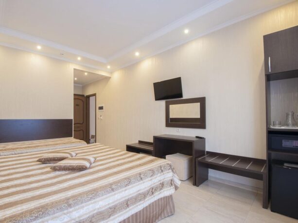 - Premium (21-25 sq. m.), there are two and three local. All rooms of this category are designed in pastel colors with a predominance of beige, coffee and green colors. They have large French-style windows (from ceiling to floor). The triple rooms have balconies with outdoor furniture.