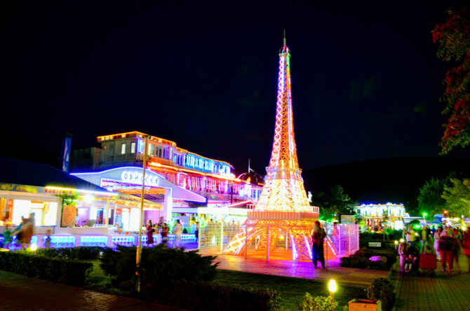 Outside the boutique hotel, resort life is always in full swing. It is enough to walk along the Embankment of Kabardinka to find something to your liking. The central promenade of the village stretches for one and a half kilometers. At the very beginning of the Embankment there is a copy of the Eiffel Tower. Its height is 12 meters and, unlike the Parisian original, the Kabardian tower is painted white. Usually from it begins the evening work of the guests of the resort.