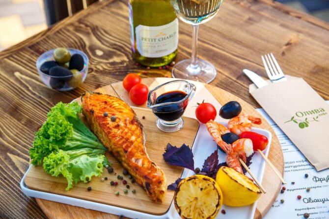 Two enterprises are engaged in the organization of catering for guests of “Achelion Park”. Restaurant “Panorama” is located on the back floor of the building under the dome. It offers a panoramic view of the surroundings of Kabardinka. The cuisine specialises in European and Greek dishes. Many products are delivered from the hotel’s farm, some of which are imported from Greece. The menu includes dishes with Feta cheese, shrimp baked on coals, Cypriot kebab, Greek salads, baked meat and seafood.