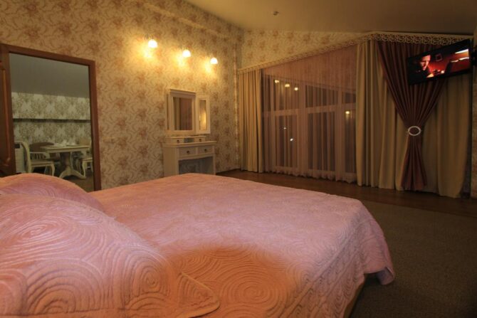 The hotel is considered a two-star, but, according to guests, has a fairly high quality of service. The number of rooms is represented by several categories: economy for two, triple rooms with a balcony, premium for four, classic suite, apartments for a large family. The building of the hotel is newly built, clean and well-groomed. Regardless of the category, the rooms are warm and spacious, with great mountain views. Cleaning is provided daily, towels and bed linen are changed regularly. Guests especially note the modern furniture, appliances and comfortable beds. All rooms, starting with the economy, have a private bathroom, refrigerator, climatic equipment, TV.