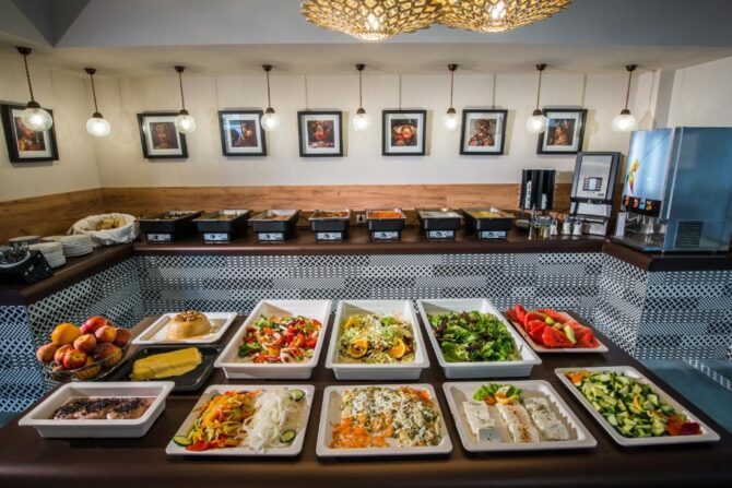 Meals are organized in the main restaurant “Senset”. Every morning at 8:00 to 10:00 the restaurant opens its doors for a delicious breakfast. All meals are served buffet style. This allows each visitor to collect the perfect breakfast option for themselves.
