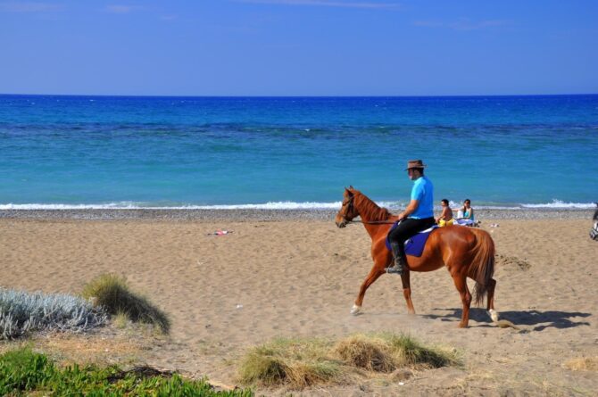 - Limanakya Beach – starts from the port and stretches to the Grecian Sands Hotel. This is the longest and widest beach of the resort. Its length is about 1.5 kilometers, in width – reaches 50 meters. The entrance to the sea is gentle, it is relatively shallow, so families with children come ashore.