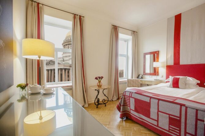 - Superior Deluxe (23 sq.m) with windows to St. Isaac’s Square and the Cathedral. These tastefully decorated rooms are ideal for both business and business travel. You can choose between a double bed or two single beds.