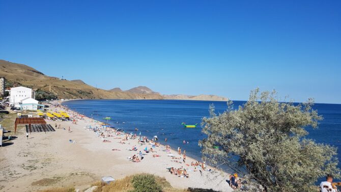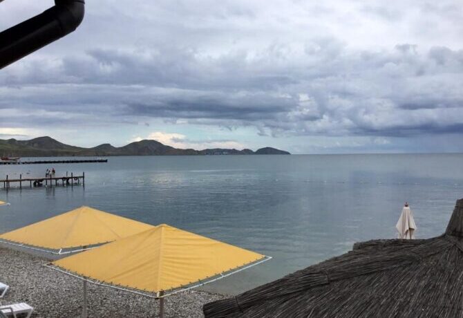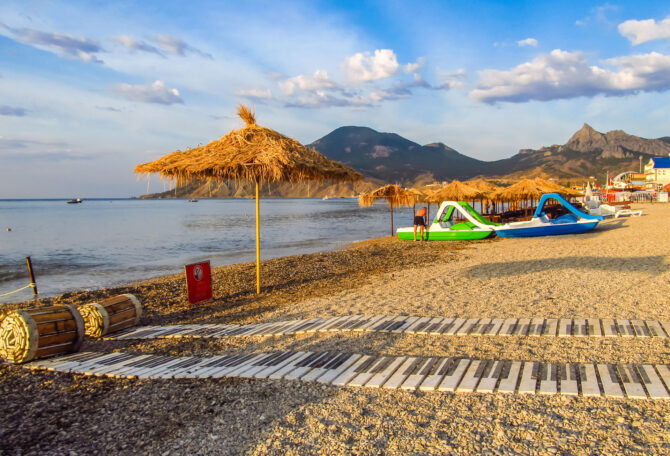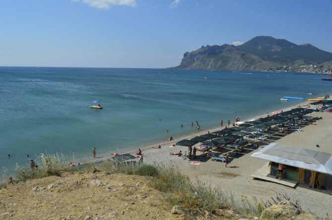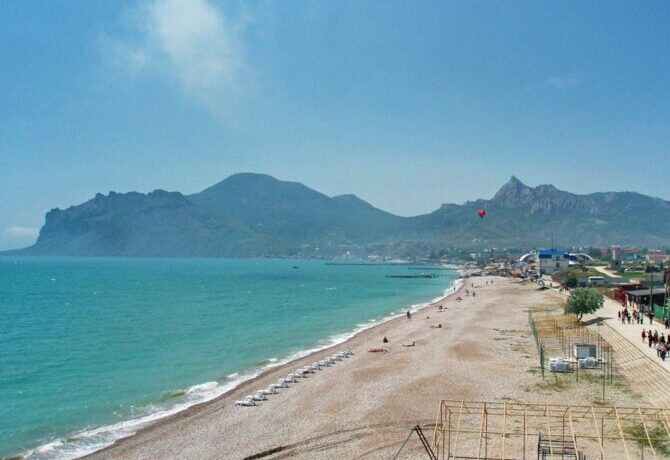 - The beach of the camp site Primorye – it is slightly smaller than the previous one. It has its own promenade, shade canopies. Two piers originate from here. From one of them go excursion boats along the Kara-Dag. The shore is covered with small pebbles, the entrance to the sea is gentle. This is a good place to relax with children. There is a large selection of water attractions. Near the beach there are several cozy cafes and canteens.