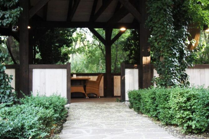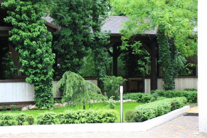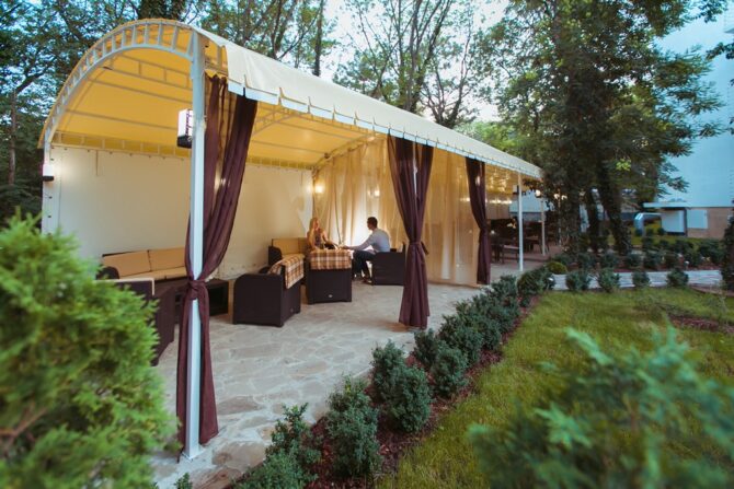 Throughout the year, an Art café is located on the territory of the hotel complex. It is located in a park area, around the buildings of the hotel. In summer, guests can enjoy an outdoor terrace, thanks to which you can enjoy your favorite dish in the fresh air in the shade of centuries-old trees. In winter, meals are served in the warm and cosy hall.