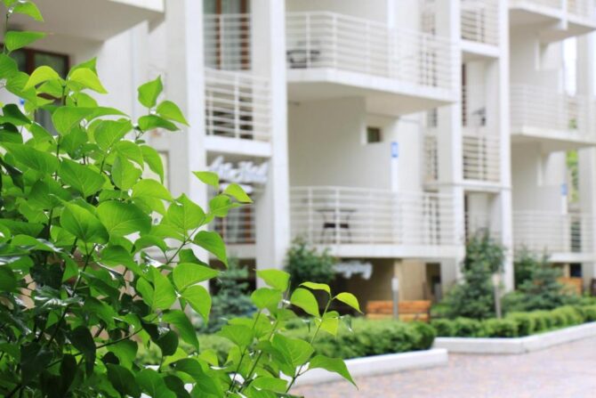 - Studio – area 29 m2. Rooms of this category are located on the 1st, 2nd, and 3rd floors. It offers views of the park. It features a balcony of 11m2. The entire guest room is divided into two zones: a bedroom with a large double bed and a small kitchen with a dining area for self-catering. Two extra beds can be added upon prior request;