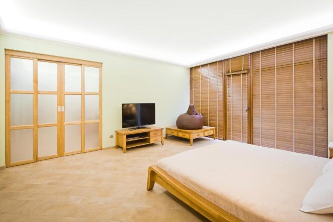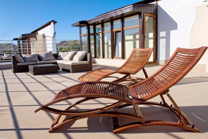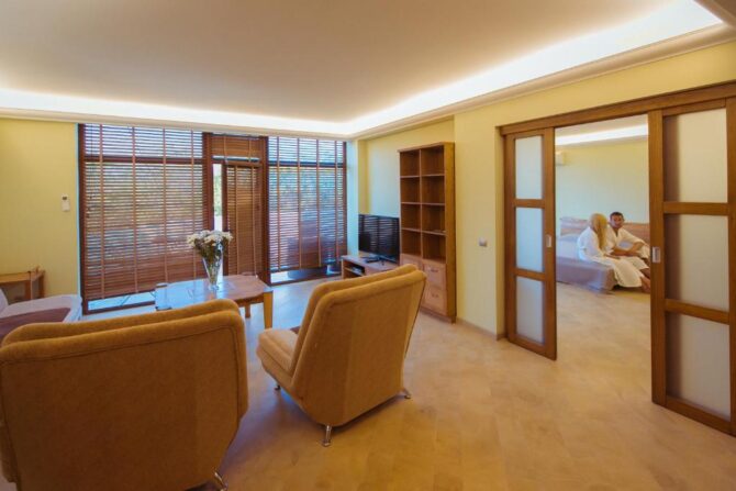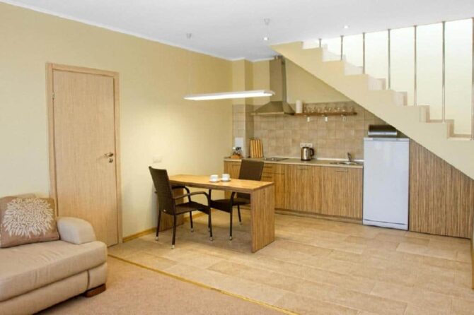 - Superior apartments – the total area of the room is 60m2. It consists of two levels. The second is a roof terrace. All furniture in the room is made of natural wood, and the kitchen is furnished with the necessary appliances for self-catering. The maximum number of guests is 5 people.