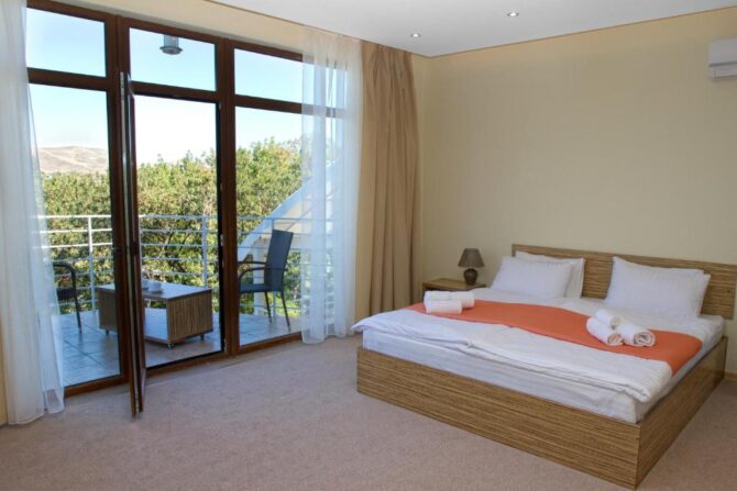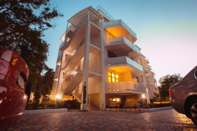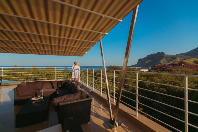 The modern building of the hotel was built in 2012. “Art Hotel” is a completely new elite complex that meets all standards and requirements. It has spacious terraces, from them you can admire the delightful views of the surrounding area. The hotel staff will do everything possible to make guests feel a real homely atmosphere and comfort. Large panoramic windows offer views of the sea coast and the extinct Kara-Dag volcano. The hotel complex itself is surrounded by rare species of centuries-old trees. It is always cozy and even in hot weather there is a feeling of coolness.