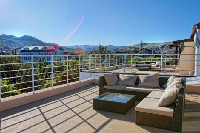- One-room suite with a terrace is a great option for connoisseurs of comfort and spaciousness. The two-level room is conditionally divided into three zones. The bedroom has a double bed of Kign Size. The living room has a comfortable sofa bed with coffee table. And in the fully equipped kitchen, guests can prepare their own dish at any time. This room has a private roof terrace, its area is 22 m2. For convenience, there are sun loungers, a table, a shower, which allows you to sunbathe directly from the chambers. From above there is a stunning view of the sea and the mountains of Koktebel;