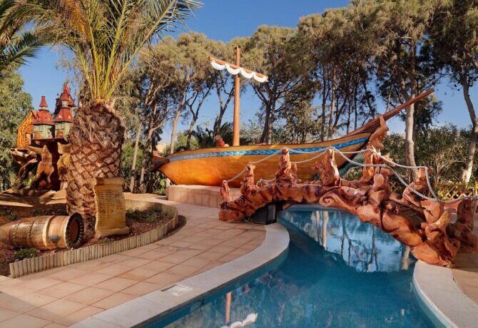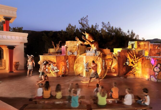 Hotels of the resort provide vacationers with multidisciplinary leisure. One of the most interesting places for children from 4 to 14 years old will be the Minoan Entertainment Club, located in the 5-star hotel complex Capsis Elite Resort. Anyone can get here. On the territory of 4 sq. km there are attractions, game rooms, thematic programs are held. The concept of the club includes a fairy-tale world of ancient Greek mythology. The main building is decorated in the style of the Minoan Palace with various game rooms. On the street there are the Minotaur Labyrinth, a small children’s pool, an amphitheater and quest areas. A unique children’s club was created to familiarize young guests of the island with the Cretan culture. Every day, the team of animators shows children puppet shows, plays performances with mythological plots, conducts quests searching for ancient artifacts and treasures on a specially equipped archaeological site. The guys can also play Robin Hood using tree houses. In the park there is a snack bar, a café. souvenir shop, buffet with sweets.