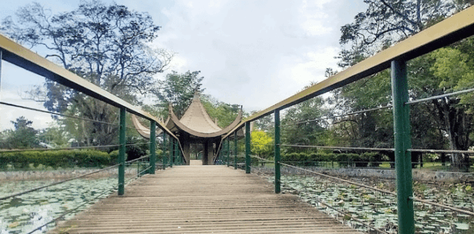 Informal planting of trees and shrubs has created a cool green oasis, and a path lined with palm trees leads to the central part of Rajapaksa Park. Here, a pond with lilies with a small Gazebo in the Japanese style in the center can be reached by the bridge from either side. Beautiful furnishings that can be rented for a wedding photo shoot.