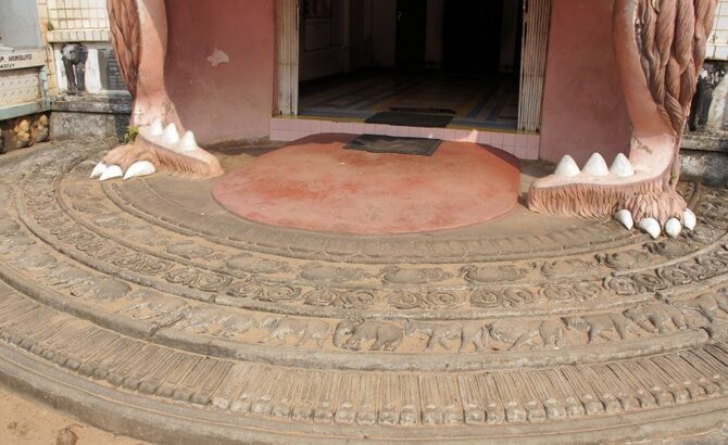 Among the features of the Temple of Angurukaramulla is an unusual entrance in the form of the mouth of a predatory beast. Admission is free, but you can buy a brochure from the monk describing the temple murals for Rs 1,000 (prices are valid for January [y]).