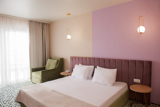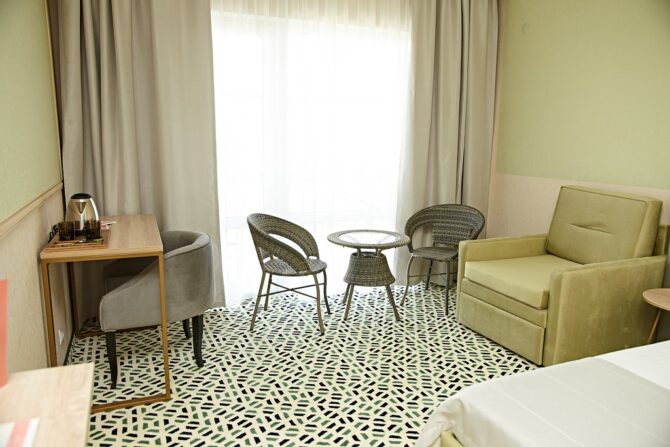 - Junior Suite (27 sq. m.) – superior one-room suite with extra beds for two children. There is no balcony.