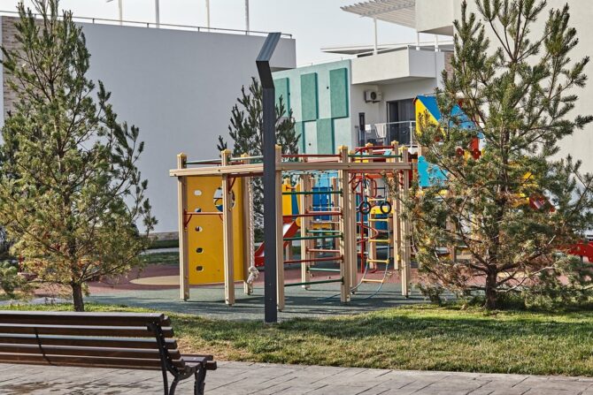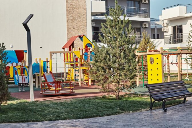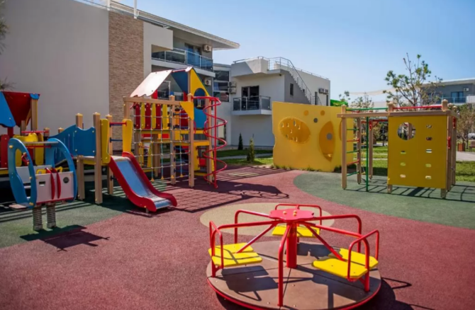 In the courtyard on the street there is a playground. It has a swing, a carousel, a mini rope town, slides, a handle with a safe rubber coating.