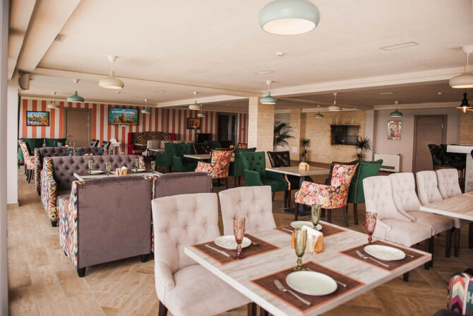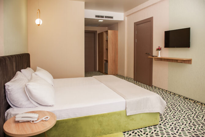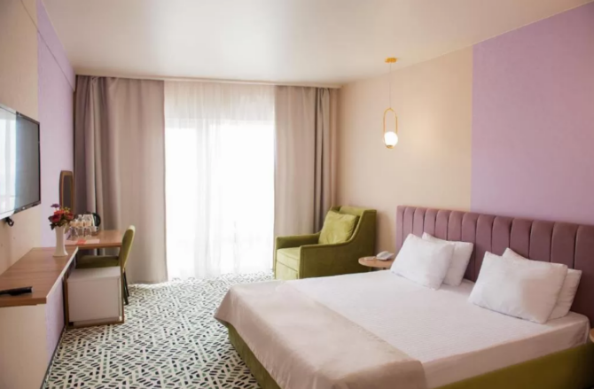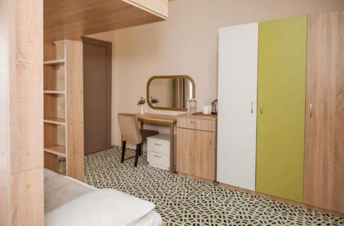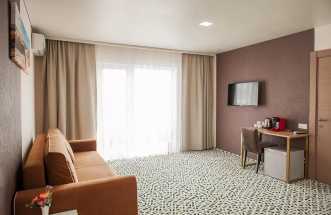 The hotel building and cottages can accommodate 672 people at the same time. The fund presents rooms of different comfort. All are equipped with TVs, refrigerators, private bathrooms, central air conditioning. A personal safe is provided for storing valuables and documents. For morning/evening tea drinking there is a tea station with utensils. The balcony has outdoor furniture. You can dry bathing suits in the dryer.